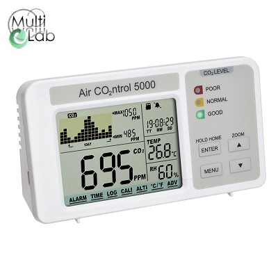 AirCO₂ntrol 5000 este un monitor de CO₂ cu funcție de înregistrare a datelor prin intermediul unui card SD. Pe lângă nivelurile de CO₂, dispozitivul măsoară temperatura și umiditatea mediului înconjurător și vă informează cu privire la dată și oră.