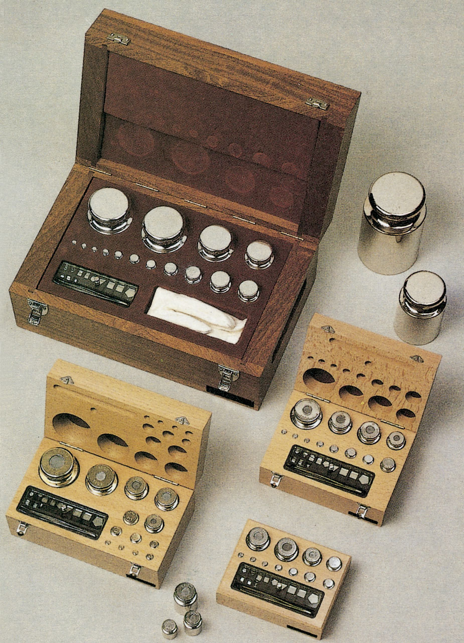 • Pentru a garanta acuratețea lor, greutățile individuale sunt livrate într-o cutie de lemn compartimentată, cu un capac cu închizător și o carcasă cu tăviță mică pentru localizarea greutăților de ordinul mg. Cutiile de lemn sunt căptușite cu catifea pentru greutățile de ordinul g și kg.